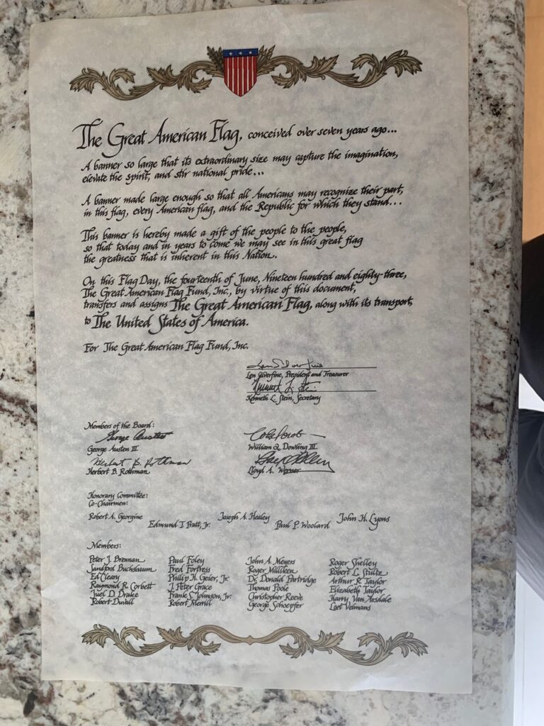 This is the scroll presented to President Reagan in the “Gifting Ceremony” at the White House. The Gifting ceremony was on Flag Day, June 14 1983. It clearly states that The Great Flag is to inspire and bring Americans together (post-Watergate and Vietnam). We have become even more, much more, divided today, increasing the need for this unifying huge symbol, our “Stars & Stripes.”