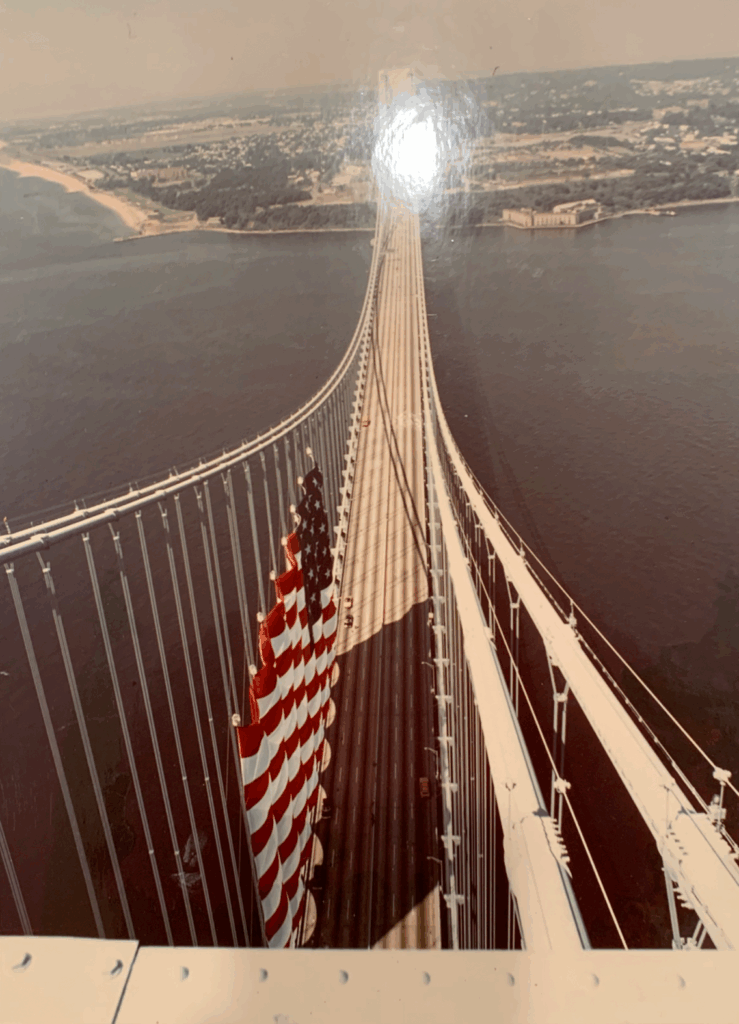 On 4 July 1876, the “Tall Ships” representing most of the world’s nations sailed into New York Harbor to kick off America’s Centennial. The Tall Ships would repeat their parade for America’s Bicentennial one hundred years later. This time, the Verrazano Narrows bridge, the largest suspension bridge in the world, spanned the harbor entrance. And, befitting the occasion, an American flag, three times larger than any flag ever made, was to hang from the bridge to welcome the Tall Ships and the world to America’s biggest birthday party.